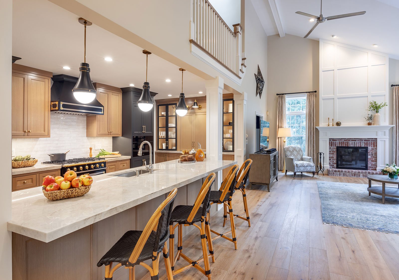This homeowner's existing kitchen already had plenty of storage as well as features that they loved, but it had become very outdated and no longer matched their style and aesthetic. They wished to bring the heart of their home up to the level that they felt the rest of their home was, and something that they could be proud of. Some of the updated features in the new design included changing the existing two-level island to an expansive one height island that allowed the kitchen to feel more open to the rest of the living space. The old countertops were replaced with Taj Mahal Quartzite for a clean and elegant feel. The clients were also not a fan of the white kitchen, and to match their style the cabinetry was replaced with custom rift cut white oak that was lightly stained, and custom black cabinetry standout features. Other new design features included all new honey-bronze hardware as well as a custom hood to perfectly match the new range. A coffee area was included off to the side of the kitchen that could be hidden away with the custom cabinetry, a new full fridge as well as two separate freezer drawers.
