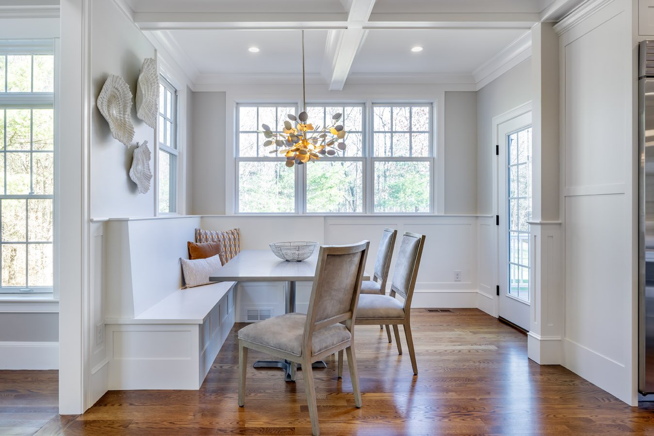 They replaced smaller cabinets with units that went to the ceiling. We suggested converting an underused bathroom into a walk-in pantry. The prior pantry was then converted to a wet bar for entertaining. A built-in banquette was added in a breakfast nook. We added a coffered ceiling, the kind of design feature that can be expected in a premium-quality home. It brought down the ceiling a bit and warmed up the space.